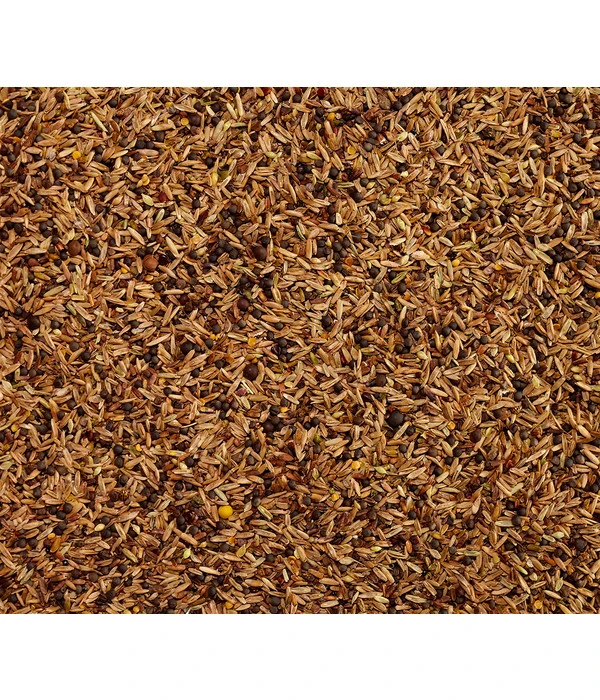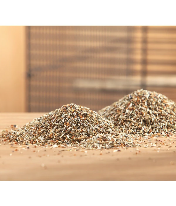 100 % Saaten: Grassamen, Ampfer, Hirse, Knöterich, Kornblume, Kamille, Mohn, Stiefmütterchen, Vogelmiere, Gänsefuß, Kleesamen und Spinatsamen + ggfs. andere Saaten je nach Vermehrung