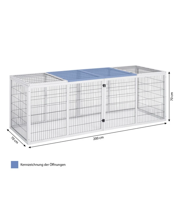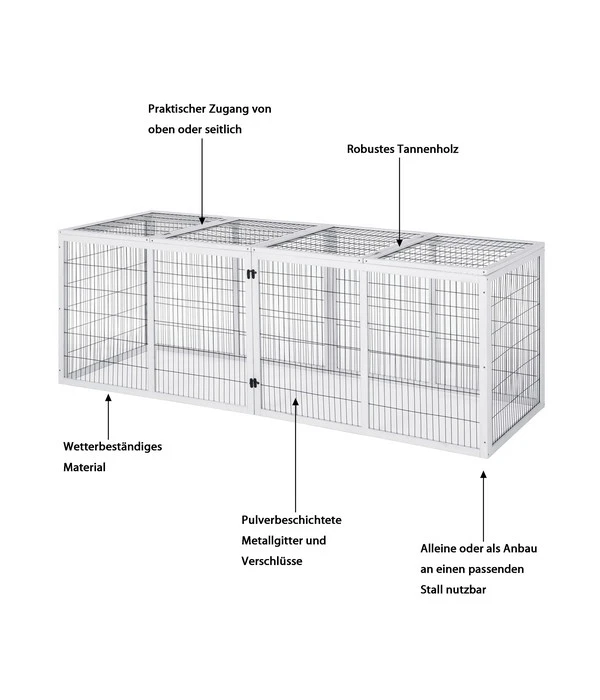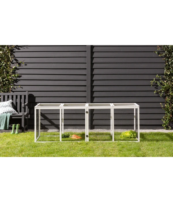 Mit seinen Maßen von 200 x 70 x 70 cm bietet Ihnen das Dehner Freilaufgehege Happy Home Monumento viele Möglichkeiten, es mit dem passenden Haus zu kombinieren. Sie können das Gehege zum Beispiel rechts und links des Hauses aufbauen, Sie können beide Gehegeteile aber auch zusammen auf eine Hausseite setzen, ganz wie es am besten zu den räumlichen Gegebenheiten in Ihrem Garten passt.