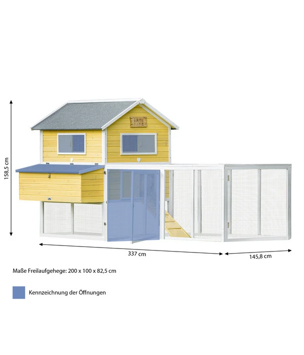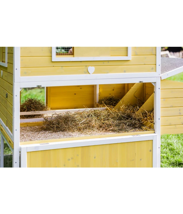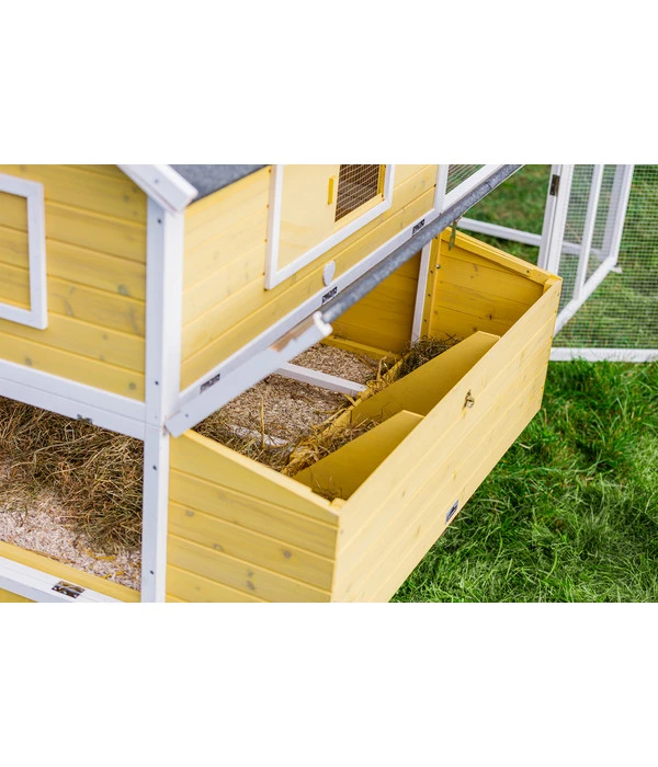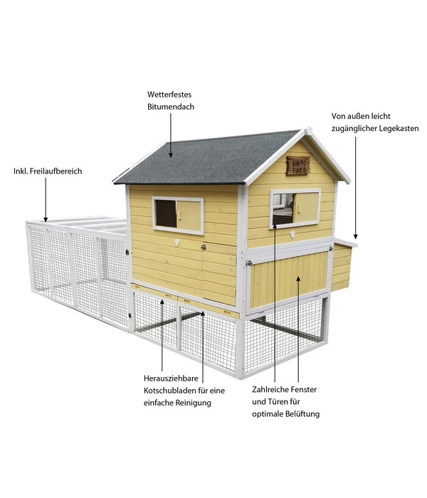 Der Hühnerstall Happy Farm Miami in bekannter Dehner Markenqualität besitzt beispielsweise eine bequeme Holzleiter und ein integriertes Legenest. Dadurch können sich die Hühnchen zum Eierlegen ungestört zurückziehen und sich sicher fühlen. Zudem sind die zahlreichen Zu- und Ausgänge am Stall und Freigehege alle mit stabilen Verschlüssen ausgestattet, damit keine Stallbewohner unbemerkt entweichen und Räuber wie Fuchs oder Marder keinerlei Zutritt erlangen können. Gegen Witterungseinflüsse ist der Gebäudebereich durch ein wetterfestes Dach geschützt. Also zögern Sie nicht länger, sondern bestellen Sie jetzt diesen komfortablen Dehner Hühnerstall Happy Farm Miami. Ihre Hühner werden es Ihnen durch eine Vielzahl leckerer Eier danken.