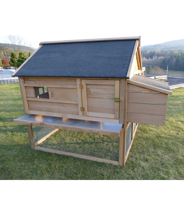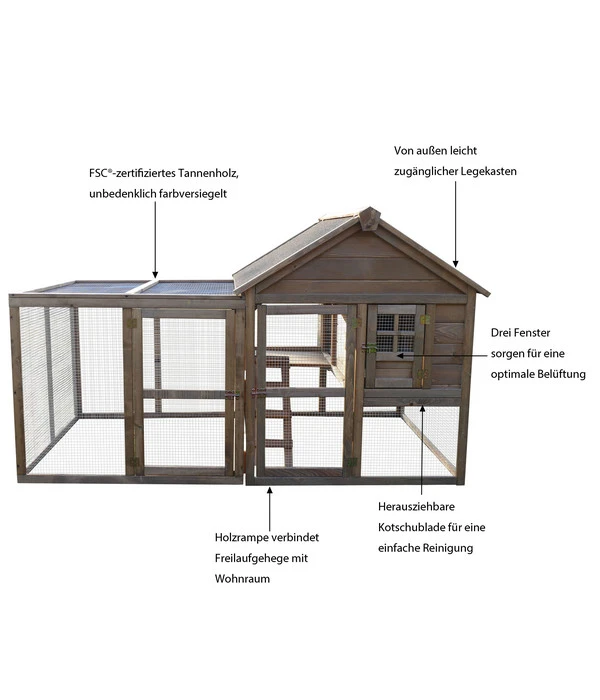 Der Dehner Hühnerstall Mondalay ist ein hochwertiges, wetterfestes Modell für die Hobby-Hühnerhaltung, das keinen Wunsch offenlässt. Die stabile Konstruktion besteht aus massivem FSC®-zertifiziertem Tannenholz, das mit einer unbedenklichen Farbe, die die DIN-Klassifizierung EN-71-3 (Europäische Norm für Spielzeugsicherheit) trägt, gestrichen wurde. Aber auch für das komfortable Handling ist gesorgt. So können Sie die Kotschublade aus Metall von außen herausziehen und säubern. Auch der Legekasten ist bequem von außen zugänglich. Der Dehner Hühnerstall Mondalay hat außerdem insgesamt 3 Fenster für eine optimale Belüftung und 4 Außentüren sowie eine Tür, die vom Innenbereich in den Freilauf führt, die alle mit stabilen Bolzen gesichert sind. Die Wandstärke des Holzes beträgt 1,6 cm.