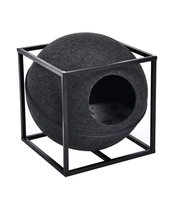 Wer seine vier Wände mit Sorgfalt und einem gewissen Anspruch an Qualität und Design einrichtet, wird sich nicht mit jedem Tier-Accessoire zufrieden geben. Die stylische Katzenhöhle mit dem würfelförmigen Gestell bietet nicht nur einen gemütlichen Rückzugsort für Ihre Katze, sondern ergänzt stilvoll jedes Wohnzimmer, Arbeitszimmer oder Flur. Das Gestell wie die Filzkugel sind in dezenten Anthrazit-Tönen gehalten, die sich in moderne Interieurs perfekt einfügen. Und das Wendekissen im Inneren begeistert mit zwei Seiten: eine unifarbene und eine mit einem modernen Blättermotiv.