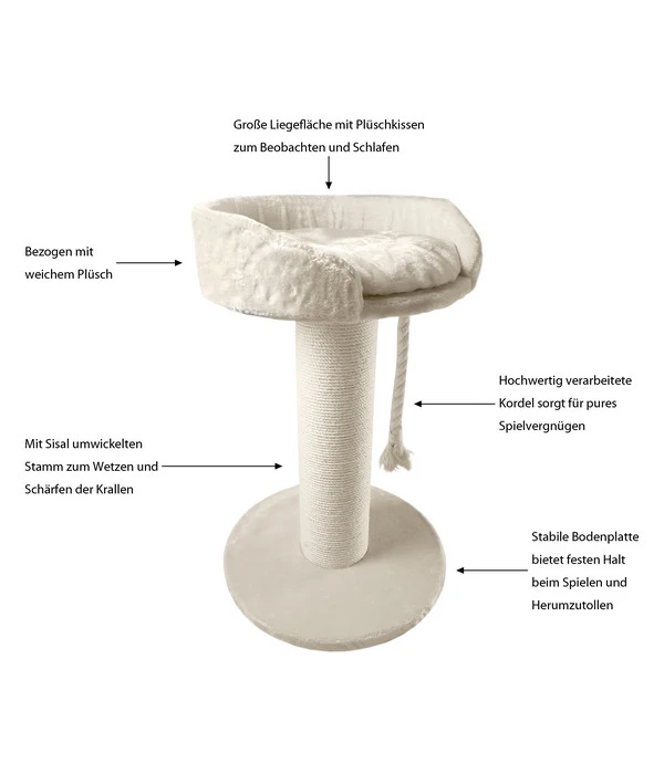 Der Dehner Lieblinge Kratzbaum Aurelio hat einen Stamm mit einem stattlichen Durchmesser von 20 cm und dieser Stamm ist komplett mit kräftigem Natursisal umwickelt. Diese Naturfaser, die meistens aus Agaven gewonnen wird, zeichnet sich durch eine besondere Festigkeit und Strapazierfähigkeit aus. Also genau das, was Ihr Samtpfote unter ihren Krallen spüren möchte, um diese messerscharf zu halten. Denn bald wird sie wieder auf Mäusejagd gehen …