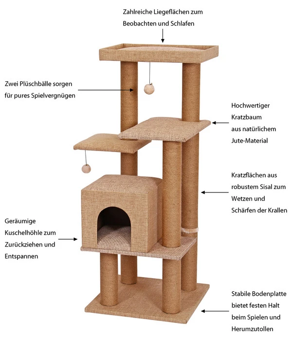 Kratzbaum, aus Jute, mit fünf Ebenen, inkl. Kuschelhöhle und zwei Spielbällen