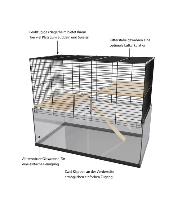 Womit haben Ihre kleinen Nager Ihr Herz erobert? Waren es die dunklen Knopfaugen oder war es die putzige Schnüffelnase? Was es auch gewesen sein mag, wollen Sie vor allem, dass es Ihren Schützlingen gut geht und sie ein Zuhause wie das Dehner Lieblinge Nagerheim Glas Palast bewohnen können. Denn darin finden sie Platz, Sicherheit und jede Menge spannende Beschäftigungsmöglichkeiten. Schon der Weg vom Boden der stylischen Glaswanne bis zur oberen Plattform bringt Bewegung ins Haustierleben. Ist die Wanne mit frischer Einstreu gefüllt, macht den Tieren das Buddeln und Spielen doppelt so viel Spaß. Bewegen sich Ihre Nagerlieblinge dabei in die Nähe Außenwand, können Sie beobachten, was unter der Oberfläche passiert. Aber auch das Erkunden der langen Holzrampen und der Plattformen werden Sie zu gerne miterleben. Der große Gitteraufsatz bietet eine optimale Luftzirkulation und sorgt so fürs Wohlfühlklima. Lassen Sie Ihre kleinen Nager also schon bald in ihr Dehner Lieblinge Nagerheim Glas Palast ziehen!