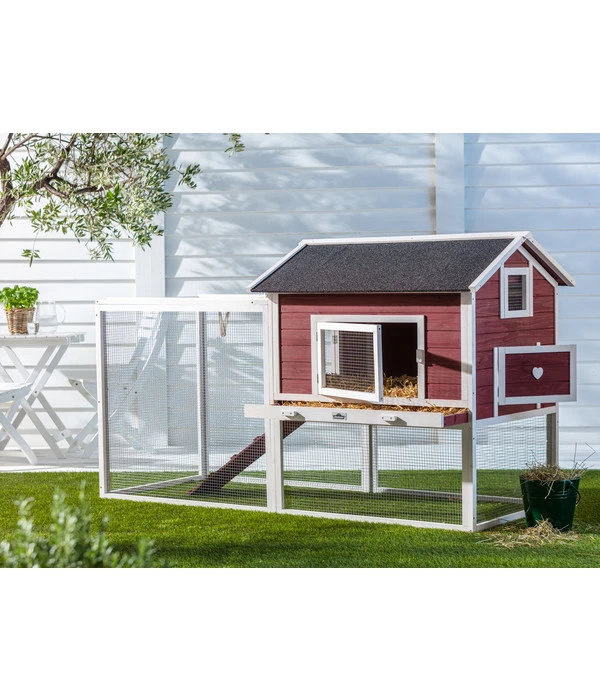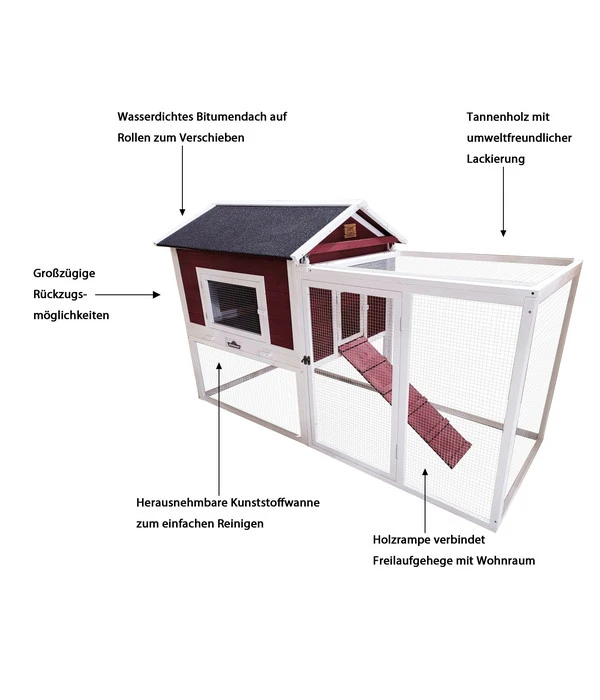 Das Traumhaus Ihrer Kaninchenbande ist eine solide Sache, denn es besteht aus Tannenholz und wurde mit einer umweltfreundlichen Lackierung versehen. Von oben schützt die Kuschelhöhle ein wasserdichtes Bitumendach, das mit einer ganz besonderen Komfort-Funktion aufwartet: Das Dach ist auf Rollen gelagert und kann zur Reinigung des Hasenstalls verschoben werden! Sie werden die Funktionen und Vorteile am Dehner Nagerheim Happy Home Zorro sehr schätzen, ganz sicher.