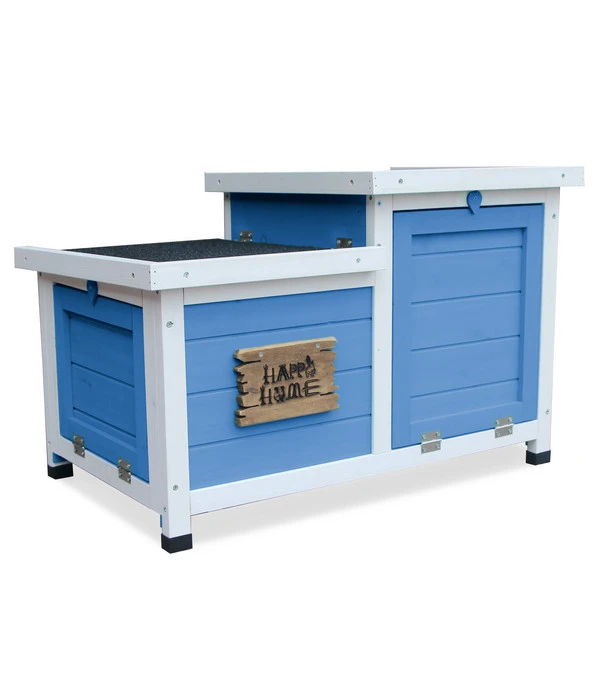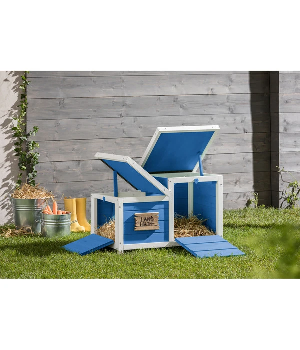 Ein Traumhaus! Das würden Ihre Kaninchen oder Meerschweinchen bestimmt beim Anblick dieser kleinen Nagervilla sagen, wenn sie sprechen könnten! Und Sie würden es verstehen. Denn das Dehner Nagerschlafhaus Happy Home Teatro hat auch Sie spontan begeistert. Mit seinem ausdrucksstarken Anstrich in Blau und Weiß versprüht es maritime Frische und gemütliche Wohnlichkeit. Da fällt die Vorstellung leicht, wie wohl sich Ihre Schützlinge darin fühlen werden. Einmal aufgestellt lassen sich die beiden Türen nach unten aufklappen, so dass sie zu praktischen Rampen für den Einstieg werden. Die beiden Dächer können aufgeklappt werden, um Licht und Luft ins Innere zu lassen. Und Sie werden Ihre Freude daran haben, wenn Ihre Kaninchen oder Meerschweinchen alles in Besitz nehmen, inspizieren, dabei mehrfach hinein und hinaus laufen und auch immer wieder oben aus dem Dach herausspitzen. Ein Dehner Nagerschlafhaus Happy Home Teatro wird Ihren Tieren viel Freude bereiten, bauen Sie es bald auf!