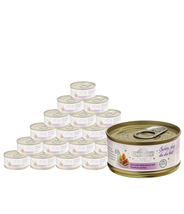 Fisch oder Fleisch – diese Frage stellt sich hier nicht, denn mit dem Dehner Premium Lovely Nassfutter Schön, dass du da bist! kann Ihr Schleckermäulchen beides zugleich genießen. Das Ergänzungsfutter in Premium-Qualität besteht aus feinster Hühnerbrust und leckerem Thunfisch, abgerundet mit ein wenig Reis. Alles sanft gegart, sodass dabei sogar noch eine leckere Brühe entstanden ist, die den Genuss für Ihre Katze perfekt macht. Da Reis glutenfrei ist, können Sie Ihrer Katze das Dehner Premium Lovely Nassfutter Schön, dass du da bist! auch geben, wenn sie eine Glutunverträglichkeit hat.