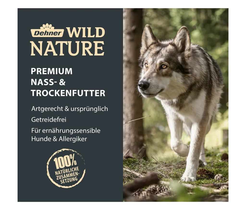 | Zusätzliche Varianten | Dehner Wild Nature Hundefutter Adult, Auwald, 6 x 400 g (2.4 kg), Dehner Wild Nature Hundefutter Adult, Gebirgssee, 6 x 400 g (2.4 kg), Dehner Wild Nature Hundefutter Adult, Hochmoor, 6 x 400 g (2.4 kg), Dehner Wild Nature Hundefutter Junior, Hochmoor, 6 x 400 g (2.4 kg) |